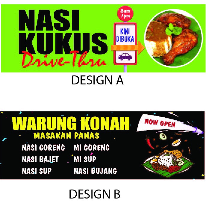 Khas buat owner bisnes diluar sana yang masih survey atau mencari tempat buat banner dan bunting yang . Banner nasi lemak ayam kukus saiz : 2' x 6' please use a good image ( fried chicken ) .